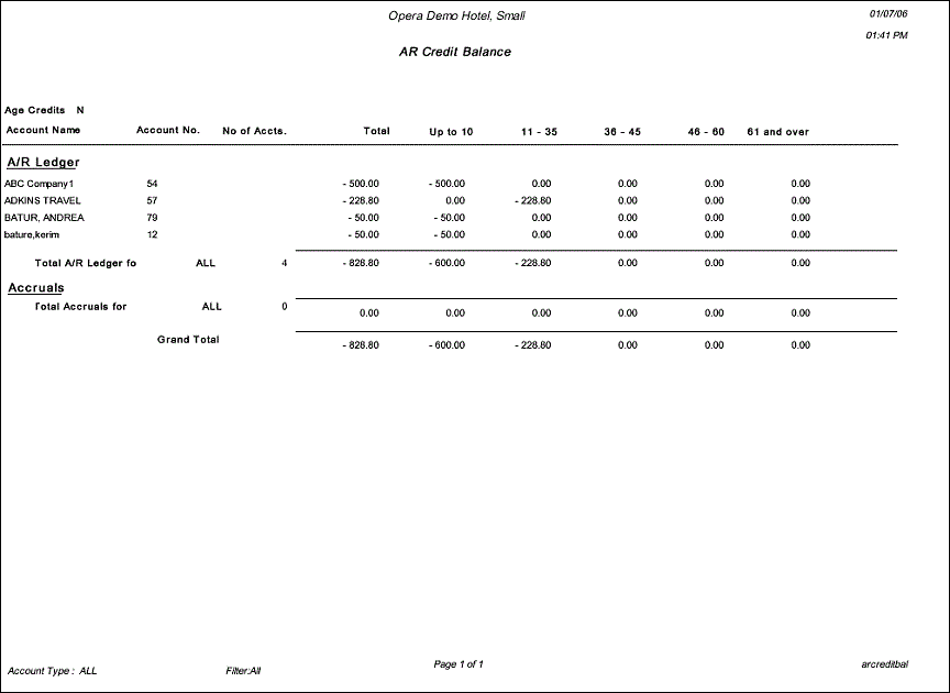 The AR Credit Balance displays to the user all accounts that have or had a credit balance on a selected business date. A credit balance is defined as the respective account having a credit on their account, rather than owing monies to the property (or a debit). The report further breaks down the credit balance into the respective aging buckets. The number of aging bucket columns displayed on the report output is dependent on the configuration of the property.