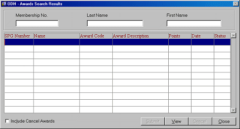 The currently highlighted member's SPG Number, Last Name, and First Name are displayed in the top portion of the screen. Each award is listed separately, such that it can be viewed or cancelled as needed.