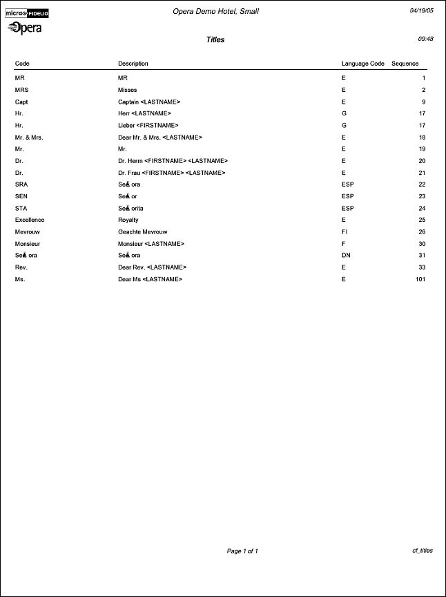 The Configuration report for Titles will display all Titles that have been configured. The output includes the language the Title has been associated. Titles are associated on the Profile form.