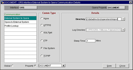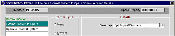 Directory. Depending on the communication data flow selected, this will be the directory for files transmitted from external system to OPERA (import directory),  or for files transmitted from OPERA to external system (export directory).