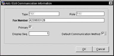 Fax. Fax number for the recipient if you choose to use the fax communication method. The confirmation/reservation update/cancellation letter is delivered directly to the recipient's fax phone number. The address designated as the primary fax address appears here by default. Select the down arrow to display the List of Fax Phone Numbers. Choose the number you wish to use, or select New Fax to specify a new number and add it to the profile. A screen appears prompting you for the new phone number information. See Adding and Editing Communication Methods, below, for more information.