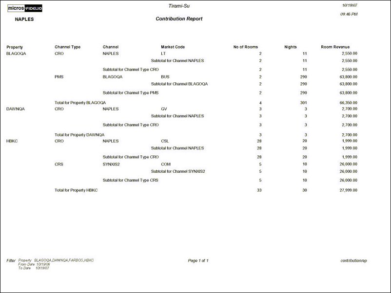 The Contribution Report displays a property's number of rooms, nights, and room revenue along with the Origin, Source, and Market Codes responsible for the reservation.