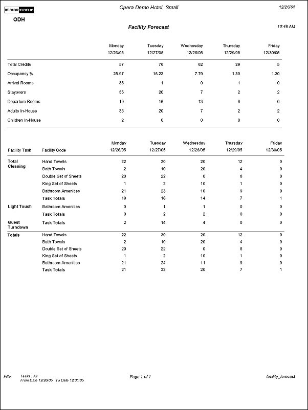 The Facility Forecast Report is available when the Rooms Management > Facility Management application function is active. The report displays a five day forecast summary for the property, that includes numbers of arrivals, stay overs, departures, adults, and children. Also displayed is a break down of the Facility Tasks as well as the total number of items needed to be completed for the selected days.
