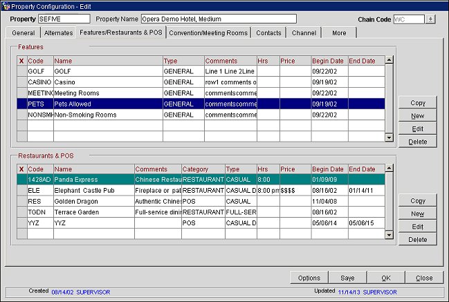 The Features/Restaurants options allow you to configure the features (pool, jacuzzi, tennis courts, golf course, spa facility) and restaurants/POS for your property. Select New to create new property features and restaurants, Edit to change property features and restaurants, and Delete to remove features and restaurants from the lists. The Features/Restaurant tab will be visible for those properties with the Multi-Property Cross Reservations add-on license code OPP MHT2 (Multi-Property Cross Reservations) activated.