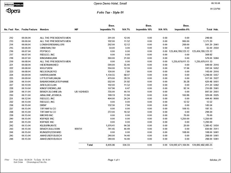 This report was developed to meet reporting requirements for properties located in Spain to display the breakdown of VAT Tax that was posted on each reservation for a specified date range.