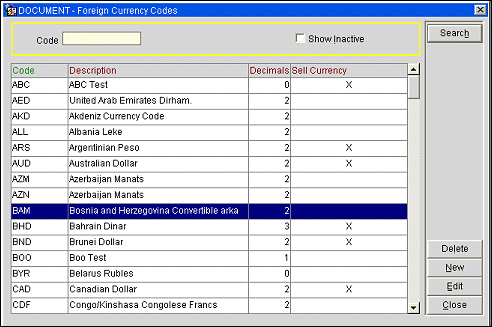 To create a new foreign currency code, select the New button on the Foreign Currency Codes screen. To edit an existing code, highlight your choice and select the Edit button. The Foreign Currency Codes - New or Foreign Currency Codes - Edit screen appears.