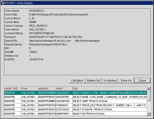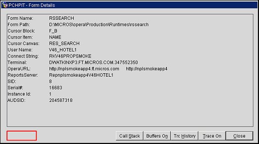 The Form Details screen provides diagnostic information that may be useful to the Oracle Support Team when called upon to investigate a problem you have reported. If requested by Support, you can access this screen by selecting Ctrl+Shift+Page Down from any OPERA screen.