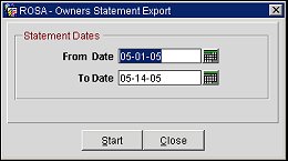 To run this report manually, select Miscellaneous>File Export>General, or Configuration>External>Export Files. From the Export File List screen, select Infinium Owner Export from the list, and select the Generate button two times. A date display appears that asks for the specific date range to compile the export for.
