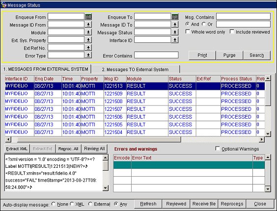 The lower part of the Message Status screen is split into a Show XML/Show Ext for the messages and a part for Errors and Warnings.