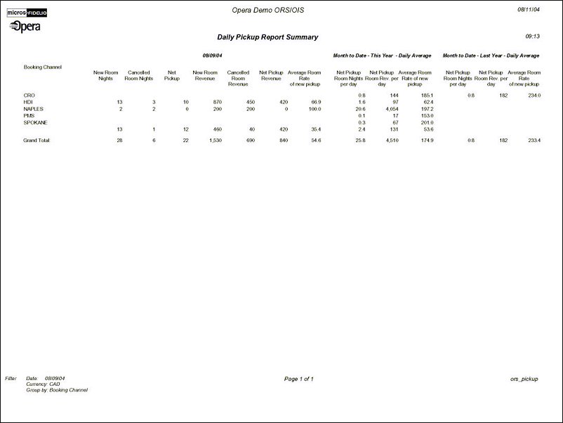 The Daily Pickup Report displays the property's pickup statistics (the number of rooms actually picked up after having been reserved) for the day selected. The report compares the days statistics with month-to-date statistics (and daily average) of this year to month-to-date statistics (and daily average) of last year. Some of the statistics for the day include: New Room Nights, Cancelled Room Nights, Net Pickup, New Room Revenue, Cancelled Room Revenue, Net Pickup Revenue, and Average Room Rate of a New Pickup.