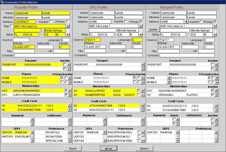This screen is accessed by selecting Match from the Suspended Profiles Match screen. It allows you to determine the exact profile data that will be inserted into the ORS database. By double-clicking on any data in the merged profile, the data will be removed; by selecting any data in the property or ORS profile, the data will be inserted into the merged profile. This three-panel screen is only available if the OXI_HUB parameter THREE_PANEL_MERGE_SCREEN is enabled.