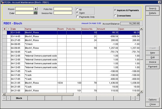 Note: The Transactions and Invoices & Payments are separated for an Owner's account in order to accumulate as many postings that may be needed for the month or fiscal period. When the Ownership > Auto Invoice Creation application function is set to Y and the owner account is at the end of the month or fiscal period, all of the postings are automatically collected into one invoice during the night audit and can then be forwarded to the owner. But if the Ownership > Auto Invoice Creation application function is set to N, then the invoices must be created manually for the month or fiscal period.