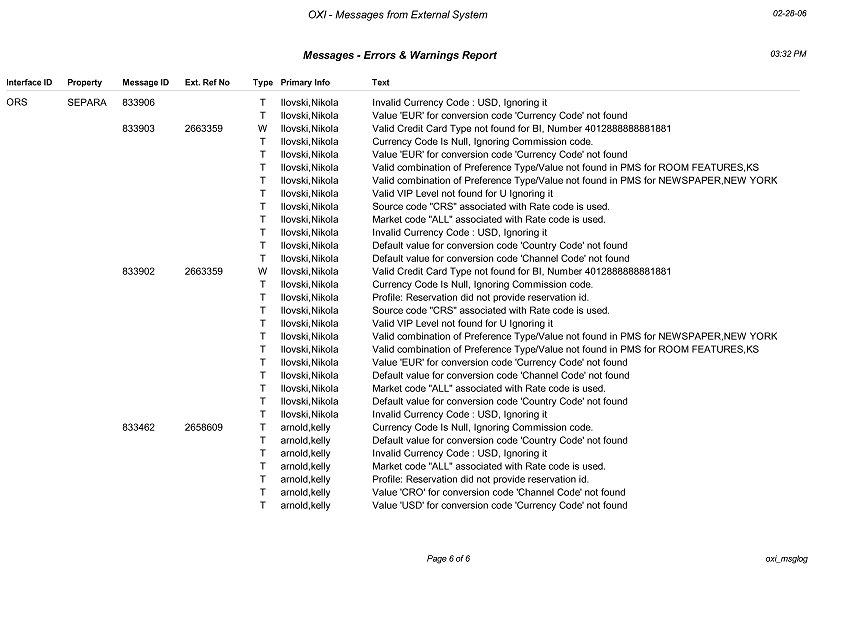 This report captures error messages and warnings for a particular interface/property based on the selection criteria used on the OXI Message Status screen. This report (shown below as Messages from an External System) contains the following data, by column: