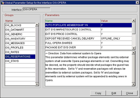 -> Direction: Data from external system to OPERA. This parameter determines whether package elements sent by external system shall overwrite ORS package elements or not. Overwriting may be desired, as the property should decide what packages the guest has in this reservation. Set to Y and reservation packages will always be overwritten by external system packages. Set to N and package elements sent by external system will be appended to existing ones in ORS. |