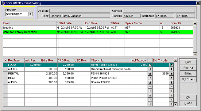 Note: It is possible to post event charges to properties other than the business block property. However, it will be necessary to add a PM (posting master reservation) for each property that postings are going to be made into.