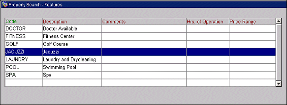 The Property Search - Features screen appears when you select the Features tab on the Sales Screen's Properties display. The Property Search - Features screen provides a list of the features that are available at the property that is currently highlighted on the Properties screen.