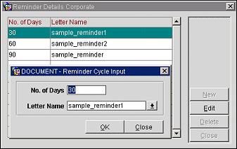 Custom reminder cycles let you determine which reminder letters are generated for accounts which have had an outstanding balance for a given number of days. A different reminder letter can be generated, for example, for outstanding balances of 30 days, 60 days, and 90 days. To set up reminder cycles for an account type, highlight the account type on the Account Types screen and select the Cycles button. The Reminder Details screen appears.