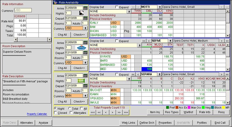 The Total Property Count value beneath the grids shows the total number of properties that can be displayed in the Rate Availability screen grids. Three property rate grids are displayed at one time. If you selected more than three properties on the Properties screen, use the scroll buttons beneath the grids to scroll to the rate information for other properties. The default display order of the properties is the same as their sequence on the Properties screen.