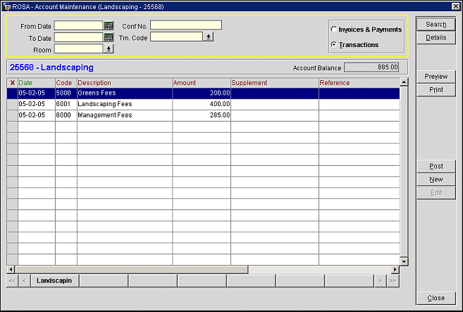 To work in the Transactions view of the Account Maintenance screen, select the Transactions option button. Your screen should appear similar to the following image: