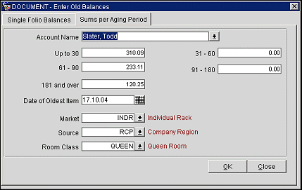 To enter old balances from external accounting systems into OPERA Accounts Receivable, select System Configuration>AR>Enter Old Balances. From the Old Balance Search screen, select the AR account to enter old balances. The Enter Old Balances screen appears. Select the Sums per Aging Period tab to enter old account balances as lump sums per the AR aging periods set up for your property.