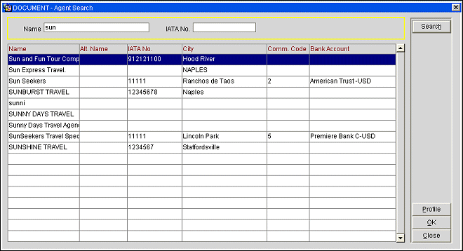 Select the Profile button to display the profile for the highlighted travel agent or source.