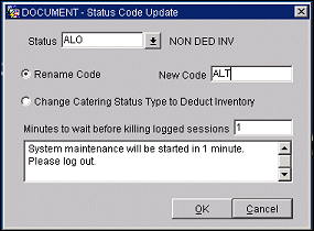 Users cannot be logged into the system while this update is being performed. The Status Code Update screen allows you to set the number of minutes before any currently logged-in user's session will be automatically terminated.