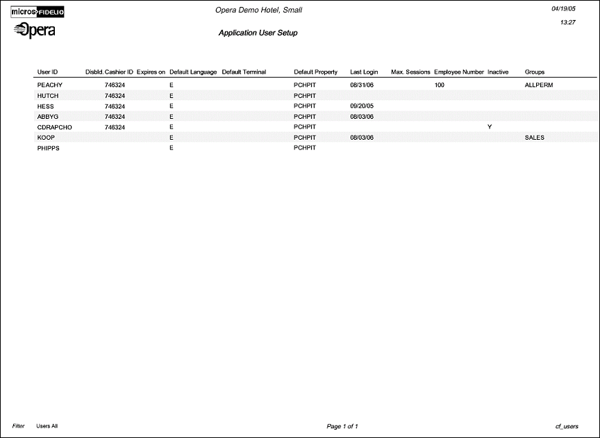 The Configuration Report for Application User Setup will display all users that have been configured in the application for the current property, users at properties to which the current logged in user has property access, and users who have access to the logged in property.