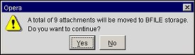 Note: Conversion from BFILE storage to BLOB storage cannot be reversed if the process fails. When an attachment is moved from BFILE to BLOB, following a successful move, OPERA updates the attachment_location to BLOB and the bfile_locator to NULL. This is so that such records will not be included next time a move is performed. Because the BFILE locator is now lost, you cannot reverse the process (move the attachment from BLOB to BFILE). The only option is to reload the WORK_ORDERS table from backup and rerun the Change Attachment Storage Utility.