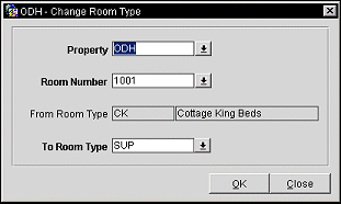 The Change Room Type to Another Room Type utility allows for a properties' specified room types on rooms, blocks, and reservations to be changed to another configured room type. Running this routine will update room types for in-house reservations and blocks, and reservations and blocks whose arrival date is the current business date or a future date. Room type is not changed on reservations or blocks for a past date.