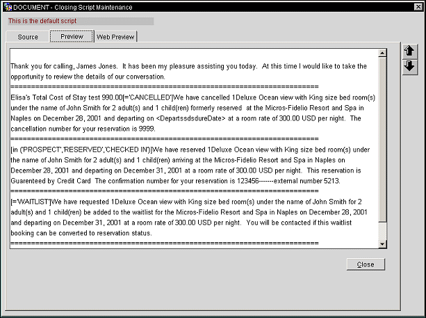 The Preview tab allows a preview of the script prior to deploying it to the properties. Preview the appearance of your closing script as it would display from the Reservation screen or the Cross Reservations screen in a Thick Client environment.