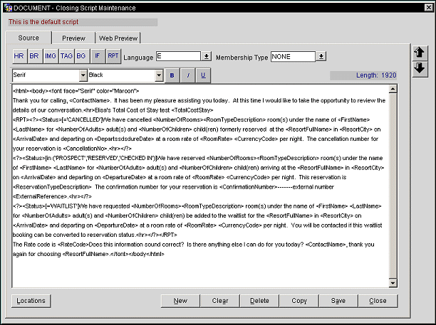 Use the Closing Script Editor to create unique closing scripts that are used to confirm customer hotel-booking details for a property. With this function you may also Edit existing scripts, Copy scripts to other locations or Delete scripts. Access this function by entering System Configuration>Reservations>Closing Script.
