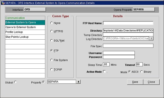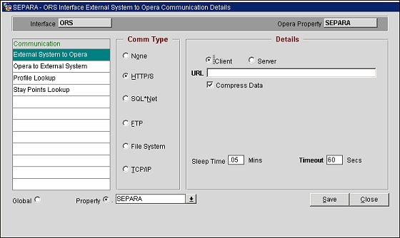 Select the Interface Configuration > Comm Methods. The <Interface ID> Interface External System to OPERA Communication Details screen displays.