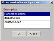 Select Setup > System Configuration > External > Back Office > System Configuration. After setting the interface translation codes, the Transaction, Market, and Statistics translations input can be performed in this option. Select the required codes from the selection menu on the screen.