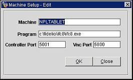 The Machine Setup screen displays a variety of information about the Interface PC, including the machine name, the program installed on the machine (IFC7 or IFC8), the controller port, and the VNC port. To configure a new machine, select the New button. To edit an existing machine configuration, select the Edit button. Select the Delete button to delete an existing configuration.
