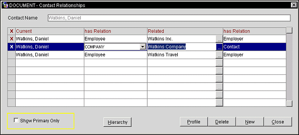 The Contact Relations screen lists the relationships that have been set up for the current contact profile. One relationship can be designated as the primary relationship. The primary relationship has an X in the Primary column. The primary relationship will be displayed at the top of the contact's Profile screen as shown below. The primary designation can be used in preparing reports on profile relationships.