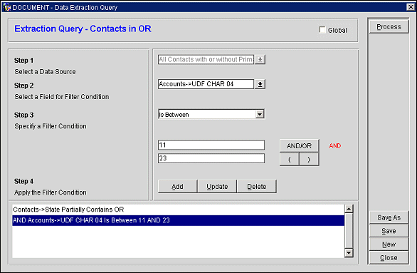 Repeat these steps to add follow-on statements, if they are required by your query. In our example, where you are looking for contacts in Illinois, you would add another query statement that selects the account address State field as the filter field in Step 2, and Is Equal To IL as the filter condition in Step 3.