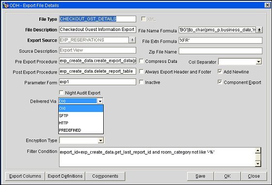 Filter Condition. Condition for the export. By default, depending on the view, all data is exported. But if a certain type of data only requires to be exported, then the condition can be filled. Technically, this is the where clause in the select statement. For example, market codes statistics export, if only certain market codes statistics are required, like FIT, COM and IND, then the condition Market code IN (FIT,COM,IND) can be entered, where market code would be one of the column names in the Export source view/table. When clicking OK, the export setup is saved and now the columns can be defined. When the export setup is saved, the button option Export Columns is available. Select this button and the entire list of columns, which are available in the view, are brought up. This occurs the first time, when setting up a new export. If the columns are already defined, then the option Export Columns lists out the columns, which have been selected. New columns can also be added.
