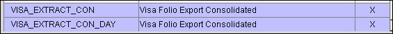 Note: When the Exports > Multi Property Export VISA application parameter is set to Y, any exports that are setup to run for multiple properties have a light blue background as seen in the following image for the VISA_EXTRACT_CON and VISA_EXTRACT_CON_DAY.