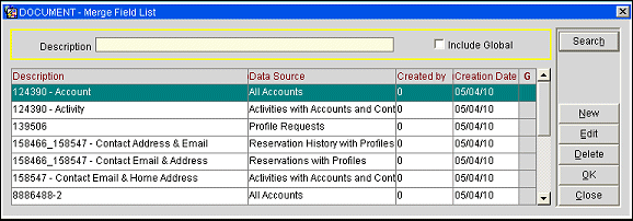 Use the Field List Maintenance feature to set up and update merge field lists that can be used when creating mail merge documents. A field list is a selection of fields from tables in the OPERA database. The field list is used with your data extraction results to create a merge file. (See Data Extraction for details.)