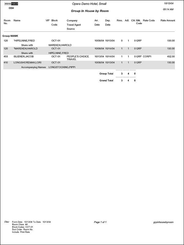 The Groups In House by Room report displays all the reservations with a group profile attached and are in house, sorted by room number. Sales personnel can print this report to check group arrival and departure activity for the hotel. This report can be used as a downtime report where group leaders may want a rooming list for all groups in-house.