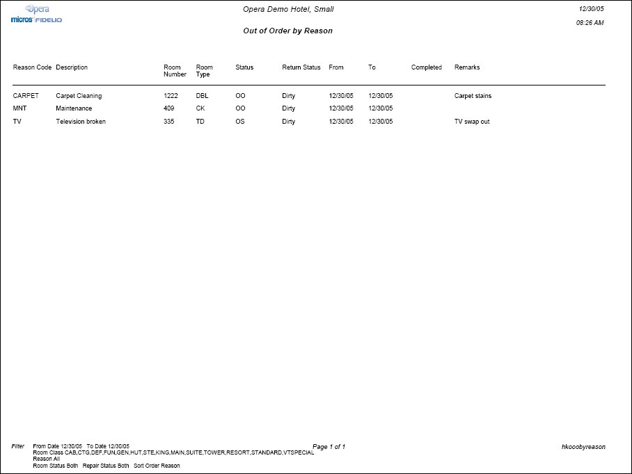 The Out of Order By Reason Report displays rooms that are out of order/out of service and the reason. Print this report to identify a list of rooms that are out of order and/or out of service for the Engineering or Maintenance departments. This report can serve as a summary of all the work orders and repairs for rooms.