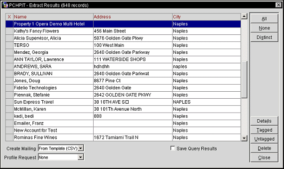 Mailing labels are created with OPERA by using the Data Extraction feature and creating the labels with a Microsoft Word template. The Extract Results screen appears when you select Miscellaneous>Data Extraction>Data Extraction Query then click the Process button. This screen shows your query results — the records that have been returned by your database query. The total number of records found is shown in parentheses in the title bar. Which specific data fields are shown in the search results grid depends on the query that you processed.