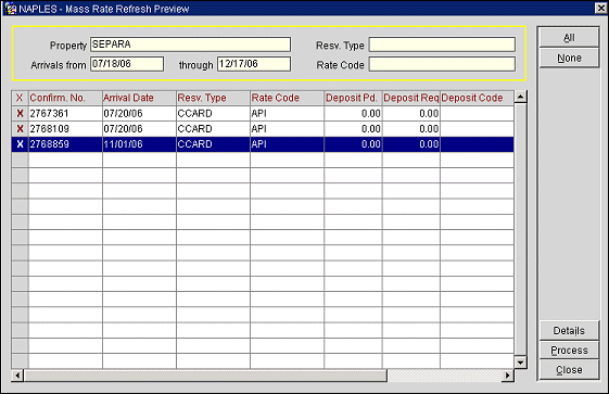 Process. Selecting this button executes the mass rates refresh process for the selected reservations on the screen.
