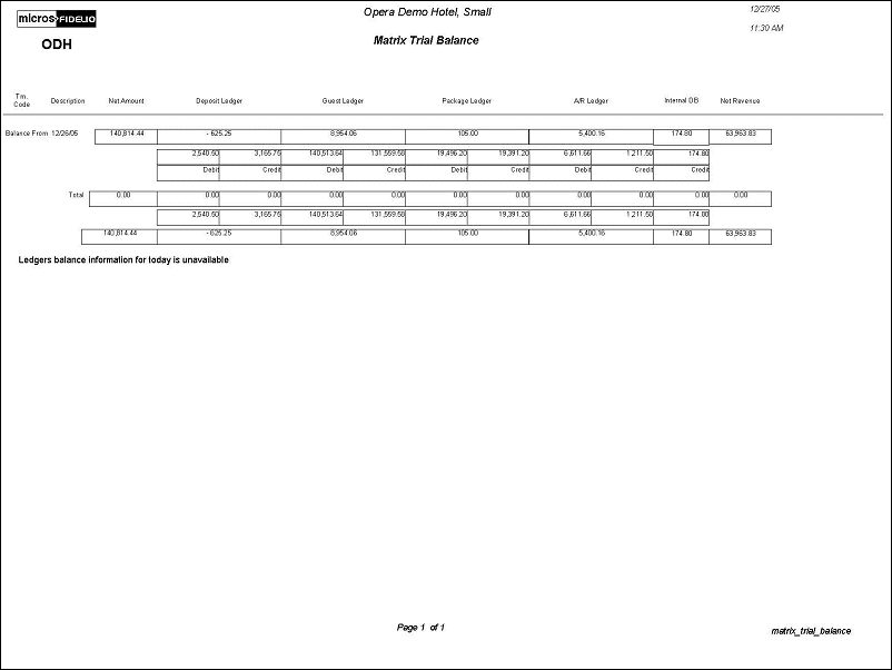 The Matrix Trial Balance Report displays a summarized financial picture of the four ledgers - Deposit Ledger, Guest Ledger, Package Ledger, and A/R Ledger. If the OPERA_AR parameter is set to ‘No’ the A/R Ledger column does not display, and if the value is ‘Yes’ the column for A/R Ledger will be displayed. The Net Amount column displays the amounts per the transaction code, and Net Revenue displays the transaction codes that have been marked as Revenue. This report is essential for the manager, as it checks whether all the important figures balance. Each section displays the opening balance for the ledger, a summary of the transactions of the day, and the closing balance. This report may be used for balancing and reconciliation for all ledgers for the day.