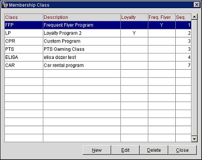 Membership Classes are used to classify Membership Programs. They can be identified as Airline Programs (Frequent Flyer Programs) or Loyalty Programs (Property Guest Loyalty Programs). Before the Membership programs can be created in Configuration>Profiles>Memberships>Types you must define the Membership Class that the program belongs to. Select Configuration>Profile>Memberships>Classes to display the membership classes that have been configured.