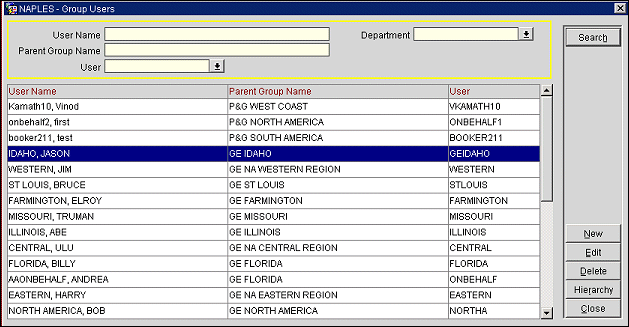Hierarchy. Displays the entire Group Hierarchy screen where you can view the group hierarchy and relationship of the highlighted user.