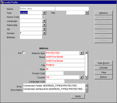 This screen is utilized to correct invalid data only. If there are invalid data in the address, membership, credit cards, phone, preference, UDF’s, and/or rates of the selected profile, the corresponding button on the right side of the screen will be enabled.