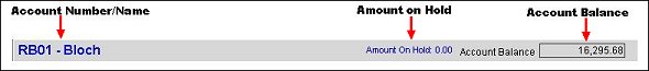 The Account Header, found directly above the account grid, displays the account name and number, the amount on hold (if any), and the total account balance.