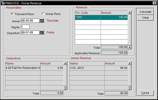 Transient Resv. Select to see the Owner Revenue calculation for a transient reservation selected for the specified dates.