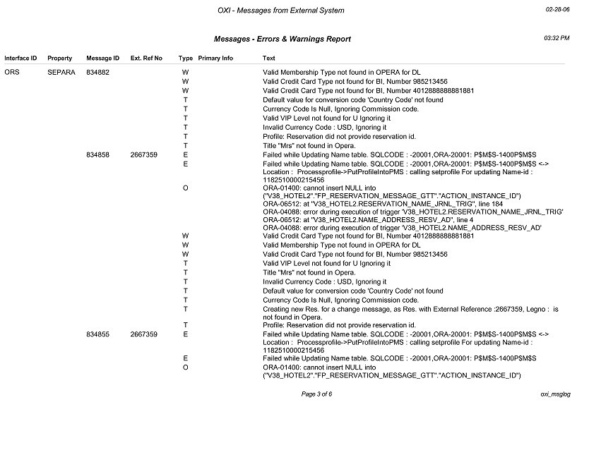 This report captures error messages and warnings for a particular interface/property based on the selection criteria used on the OXI Message Status screen. This report (shown below as Messages from an External System) contains the following data, by column: